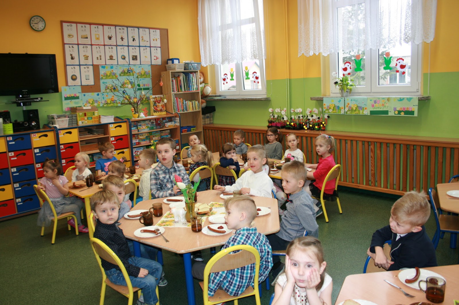Dzisiejszy dzień rozpoczęliśmy od wielkanocnego śniadania przy pięknym udekorowanych stołach z tradycyjnymi pokarmami: jajkiem, kiełbaską, chlebem, babą wielkanocną i barankiem. Złożyliśmy sobie wzajemnie życzenia i z apetytem zjedliśmy śniadanko.